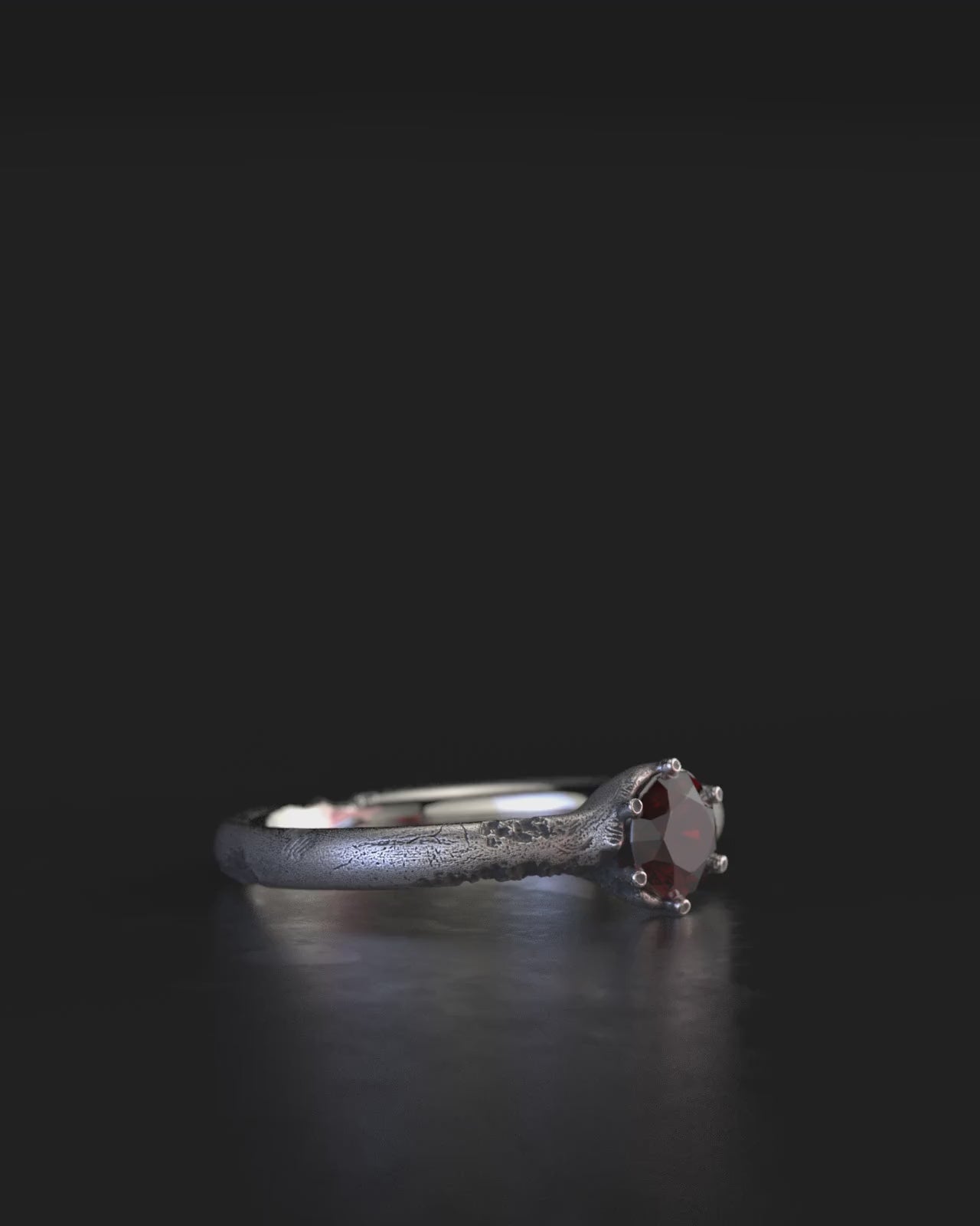 Delicate but raw, this sterling silver ring features a deep red natural ruby set in six claws —a classic silhouette disrupted by subtle scars and irregularities along the band. Each mark is deliberate, left as a trace of the manual process behind the piece. Inside, a smooth, mirrored finish offers balance —light against roughness, calm beneath chaos.